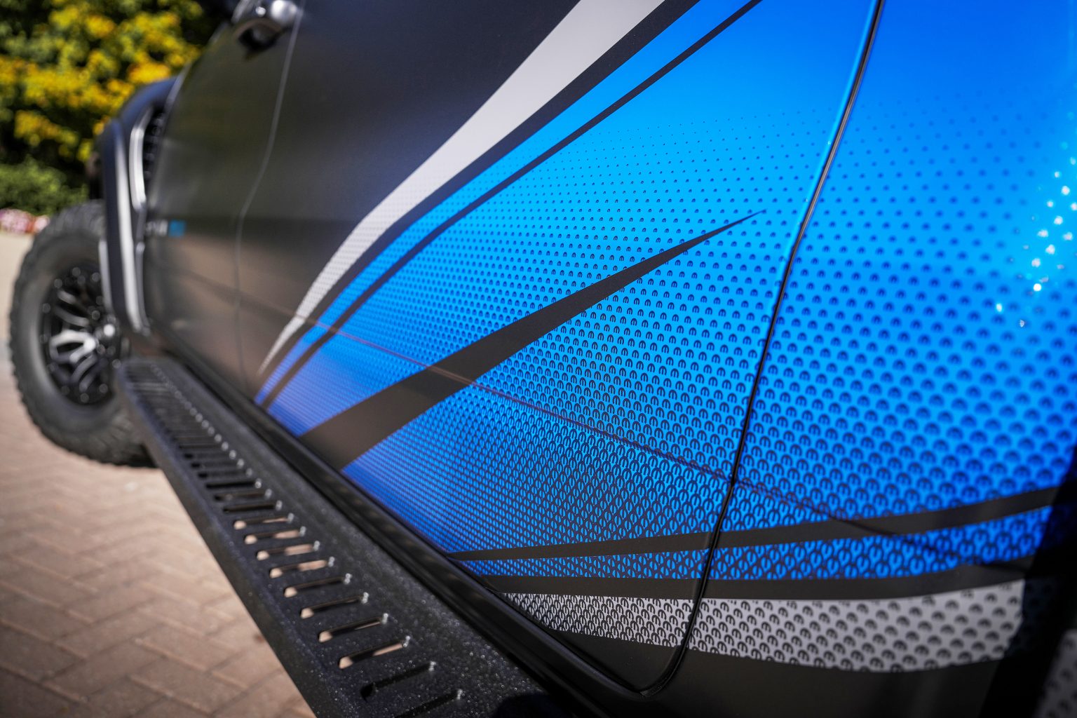 Custom bold Mopar Blue bodyside graphics on the Moparized Ram 1500 RHO provide a striking contrast from the satin metallic Diamond Black exterior underneath.
