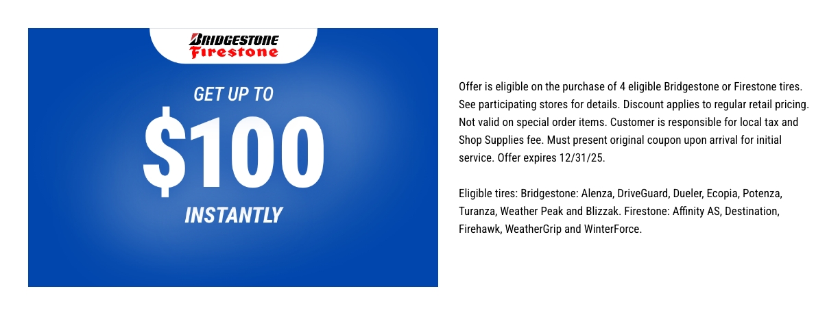 Drive with confidence by finding the right tire for you and your vehicle. And for a limited time, you can get up to $100 off instantly on a purchase of four eligible Bridgestone or Firestone tires. Expires 12/31/25—contact your dealer to take advantage of this great offer today!