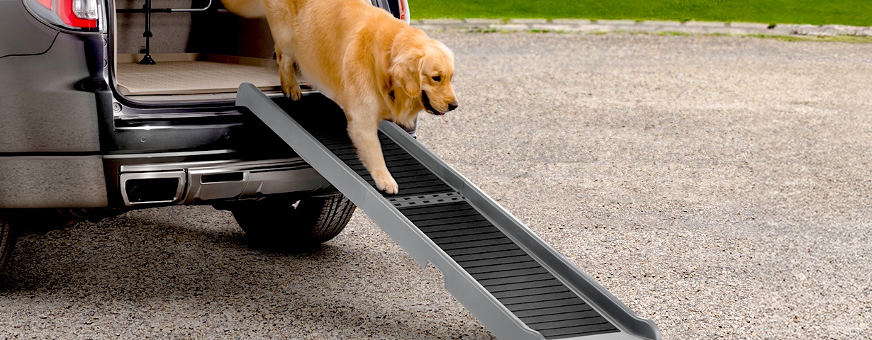 Tails will wag, backs will be saved. The WeatherTech® Pet Ramp was designed for the comfort of our furry friends and their handlers. The foldable, portable Pet Ramp features a non-slip surface providing dogs, cats and pets of all sizes easy access to SUVs, minivans, trucks and hard to reach household spaces.